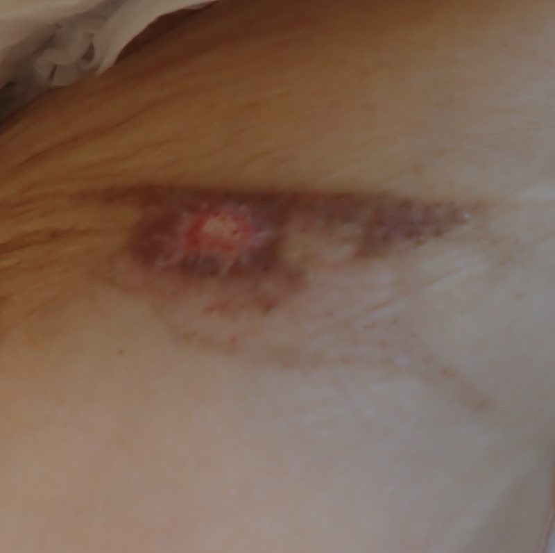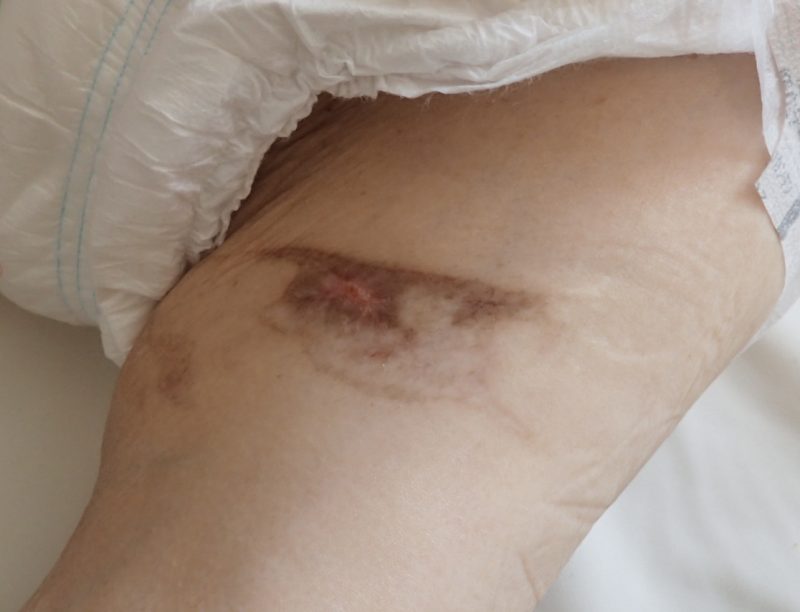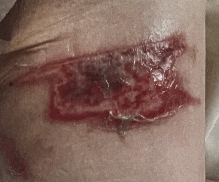 施設から、創が深くなっているようにもみえるが、湿潤療法を継続していていいものかどうか問い合わせがありました。これは時間経過により本来の損傷深度が顕在化しただけで、悪化しているわけではないと判断しました。創に感染徴候もなく、湿潤療法を継続するように指示しました。
