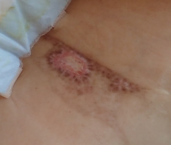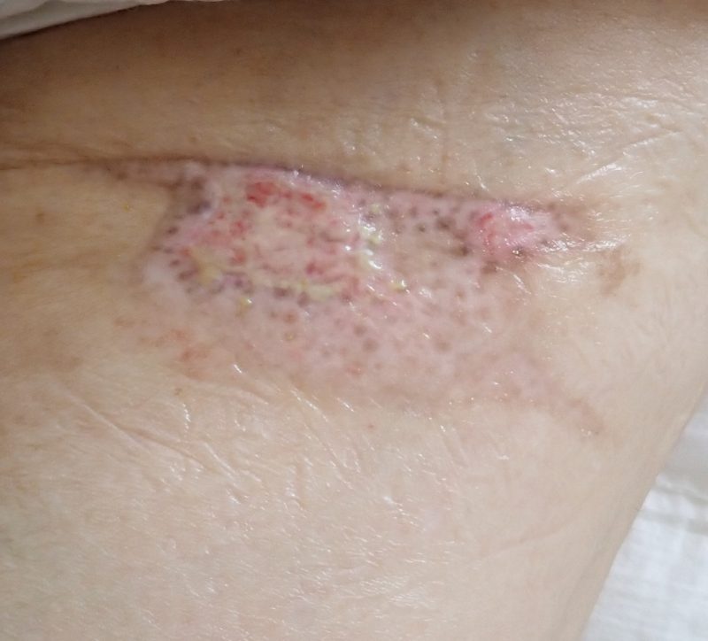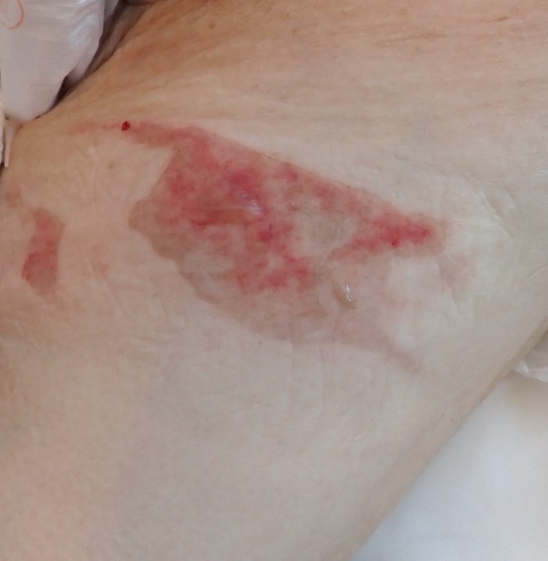 ほぼ上皮化しました。被覆材は終了し、プロペトを塗布するように指示しました。